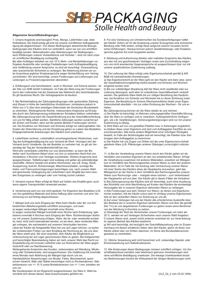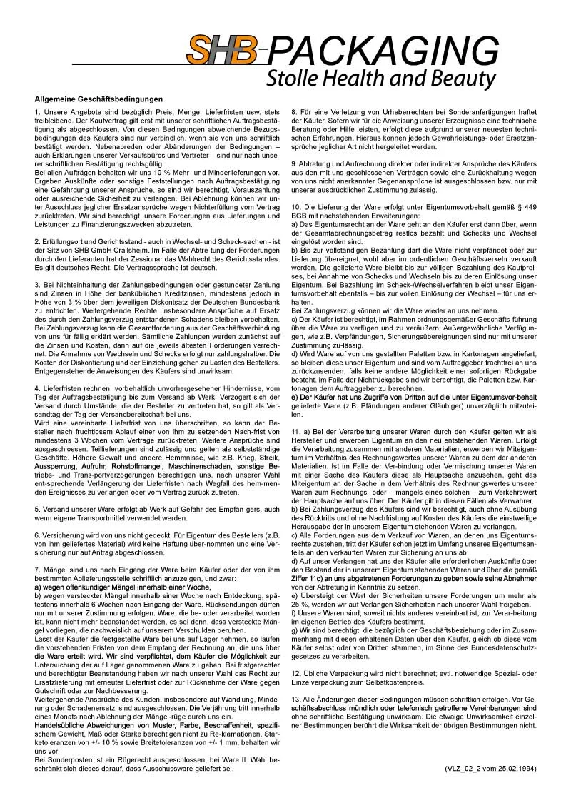 12. Übliche Verpackung wird nicht berechnet; evtl. notwendige Spezial- oder Einzelverpackung zum Selbstkostenpreis.