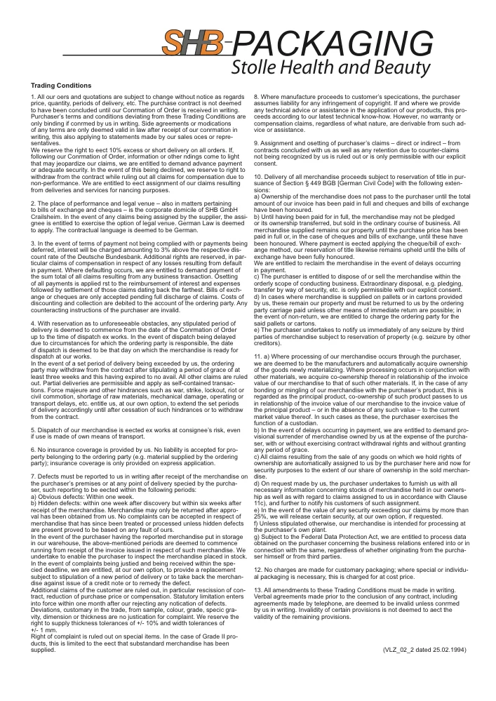 2. Erfüllungsort und Gerichtsstand - auch in Wechsel- und Schecksachen - ist der Sitz von SHB GmbH Crailsheim. Im Falle der Abtretung der Forderungen durch den Lieferanten hat der Zessionar das Wahlrecht des Gerichtsstandes. Es gilt deutsches Recht. Die Vertragssprache ist deutsch.